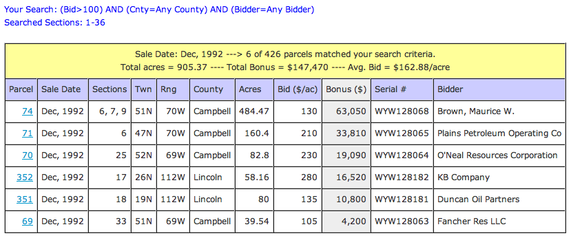 - If your query matched a parcel(s) the Total Acres, Total Bonus, and Avg Bid (Total Bonus