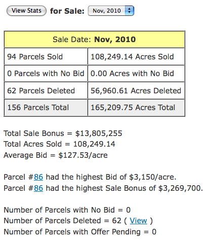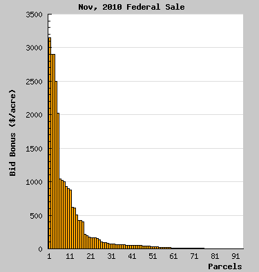 This graph shows the winning bid bonus ($/acre) for every parcel sold at the sale. The bids are sorted from high to low.