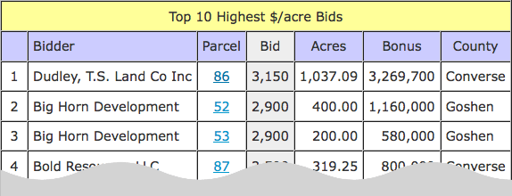 Following the graph are two tables displaying the Top 10 Highest $/acre Bids and Bonus Amounts. Clicking on the parcel number will display detailed parcel information. If more than one lease has identical bids, the parcel with the highest bonus is listed first.