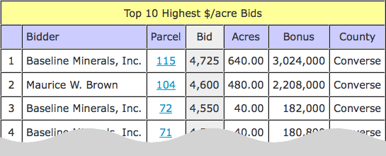 Following the graph are two tables displaying the Top 10 Highest $/acre Bids and Bonus Amounts. Clicking on the parcel number will display detailed parcel information. If more than one lease has identical bids, the parcel with the highest bonus is listed first.