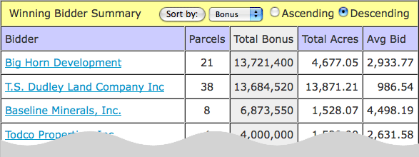 This graph shows the winning bid bonus ($/acre) for every parcel sold at the sale. The bids are sorted from high to low.