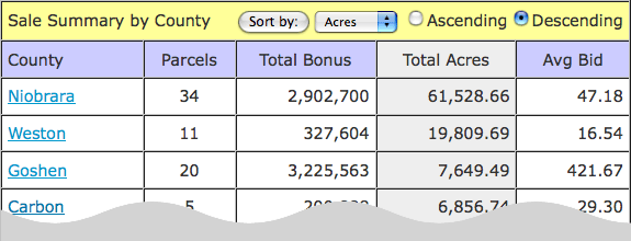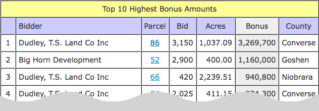 Following the graph are two tables displaying the Top 10 Highest $/acre Bids and Bonus Amounts. Clicking on the parcel number will display detailed parcel information. If more than one lease has identical bids, the parcel with the highest bonus is listed first.