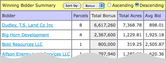 This graph shows the winning bid bonus ($/acre) for every parcel sold at the sale. The bids are sorted from high to low.