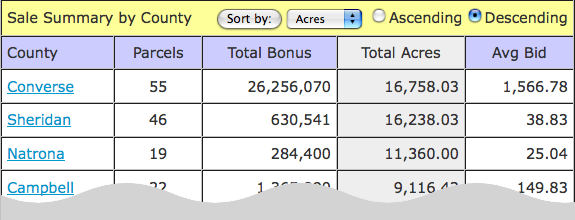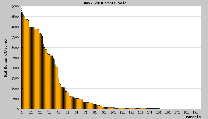 This graph shows the winning bid bonus ($/acre) for every parcel sold at the sale. The bids are sorted from high to low.
