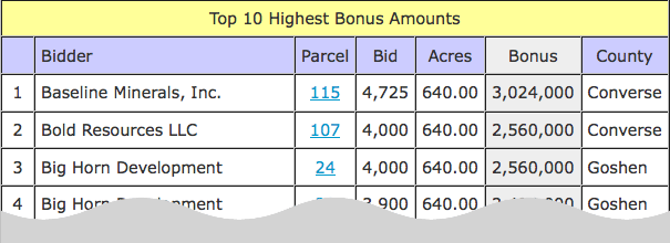 Following the graph are two tables displaying the Top 10 Highest $/acre Bids and Bonus Amounts. Clicking on the parcel number will display detailed parcel information. If more than one lease has identical bids, the parcel with the highest bonus is listed first.